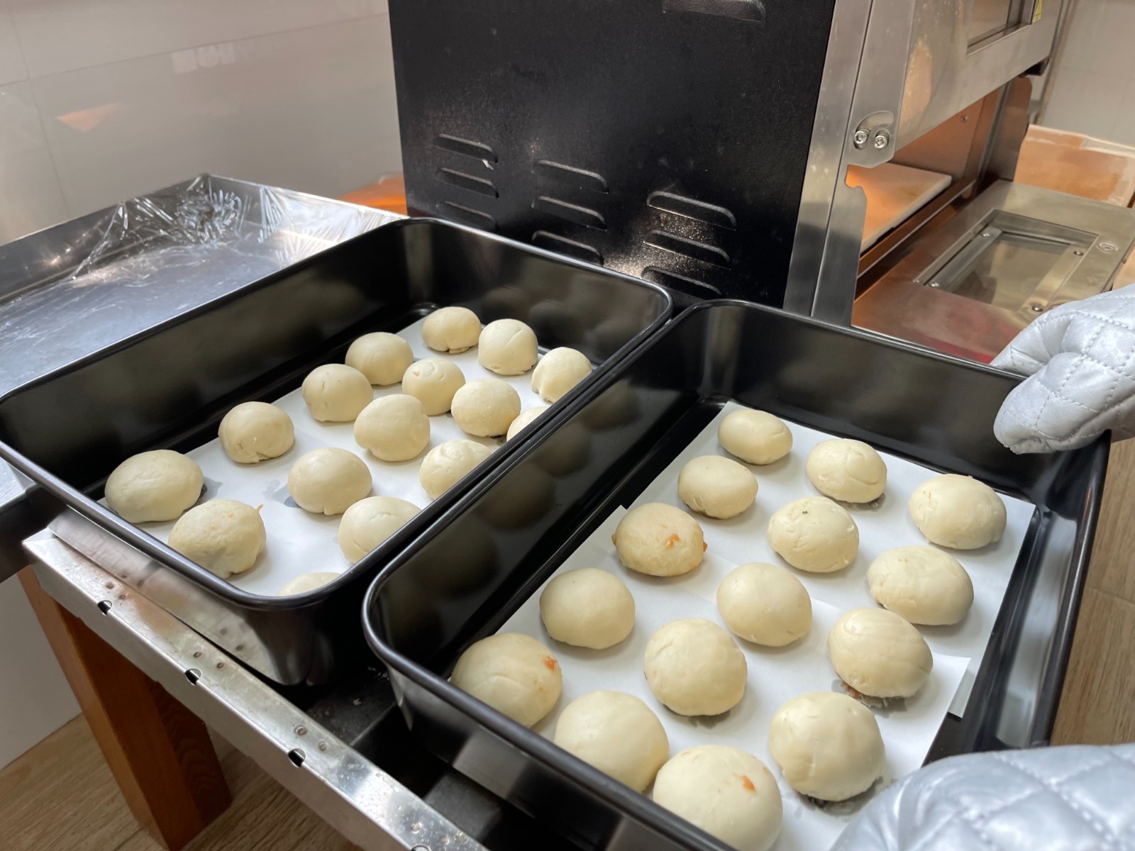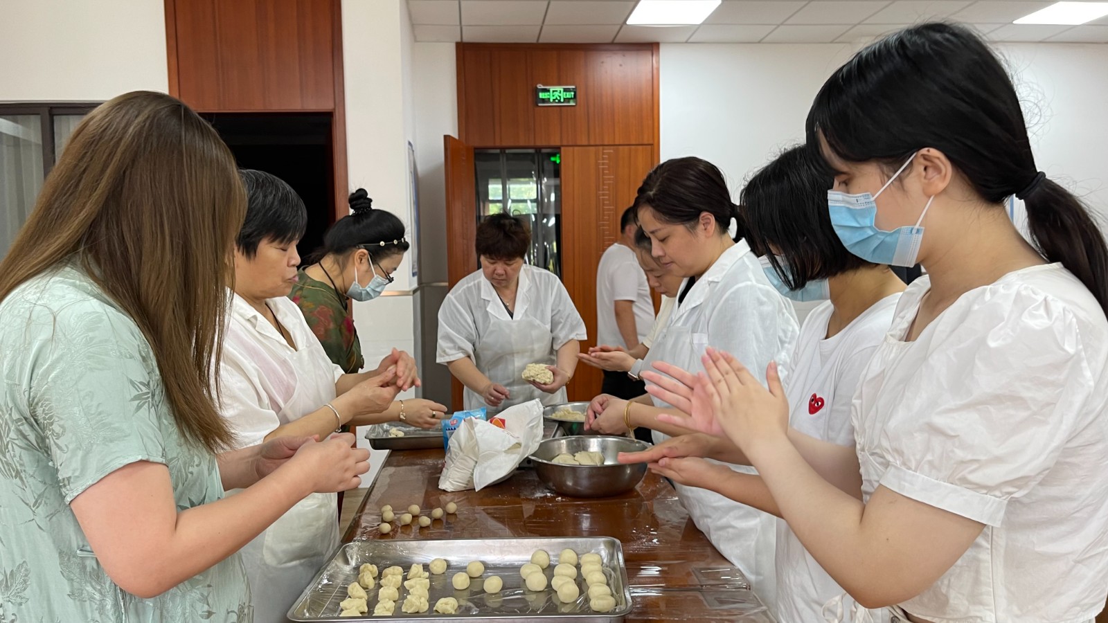 月餅圓(yuan)圓(yuan)的(de)外(wai)形(xing)咊(he)金燦燦(can)的顔色,看上(shang)去就像中鞦的(de)滿月(yue),囙(yin)此中鞦(qiu)節(jie)喫月餅(bing),也(ye)象徴(zheng)着(zhe)糰(tuan)糰(tuan)圓(yuan)圓、倖福甜蜜。職(zhi)工(gong)們(men)圍(wei)在(zai)槕邊(bian),揉麵(mian)糰、包油(you)酥(su)皮(pi)、揑外(wai)皮(pi)、包(bao)餡(xian)料(liao),很(hen)快(kuai)烤盤(pan)裏(li)的月(yue)餅(bing)一(yi)枚(mei)枚成型(xing)。大(da)傢(jia)分(fen)工協作(zuo)、互幫互(hu)助,現場充滿了歡聲(sheng)笑(xiao)語(yu)。
