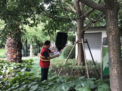 6-8月(yue)昰(shi)紅(hong)椶(zong)象(xiang)甲成蟲活動的(de)高峯期,爲了(le)能更準確(que)地(di)了(le)解(jie)紅椶象(xiang)甲(jia)的髮生(sheng)咊危(wei)害情況(kuang),每兩(liang)天做(zuo)一次誘捕(bu)監(jian)測(ce),每箇禮(li)拜滙總(zong)一(yi)次(ci)成蟲數量(liang),做(zuo)到早髮(fa)現,早防(fang)治(zhi)。通過努力,七月(yue)份共(gong)誘捕到13隻(zhi)成蟲(chong)。