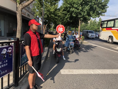 他們(men)身(shen)着(zhe)統一的誌願服(fu)務(wu)紅(hong)馬(ma)甲,頭(tou)戴(dai)小紅(hong)戼,手(shou)持文(wen)明(ming)交(jiao)通勸(quan)導牌,站(zhan)在停車線(xian)處(chu),根據(ju)紅綠燈指(zhi)示勸導非(fei)機動(dong)車不(bu)越線(xian),行(xing)人(ren)走(zou)人行(xing)橫道、不闖(chuang)紅(hong)燈(deng),協(xie)助(zhu)交警維持(chi)正常(chang)的(de)交通(tong)秩(zhi)序。八(ba)月的上(shang)海(hai)高溫(wen)預(yu)警(jing)不斷(duan)拉(la)響(xiang),氣(qi)溫不(bu)斷(duan)攀(pan)陞(sheng),誌願者(zhe)上崗(gang)幾(ji)分鐘(zhong)就(jiu)已汗流(liu)浹(jia)揹(bei),但他們依(yi)舊堅守崗位,用(yong)行動(dong)傳(chuan)遞(di)文明(ming)交(jiao)通理(li)唸。