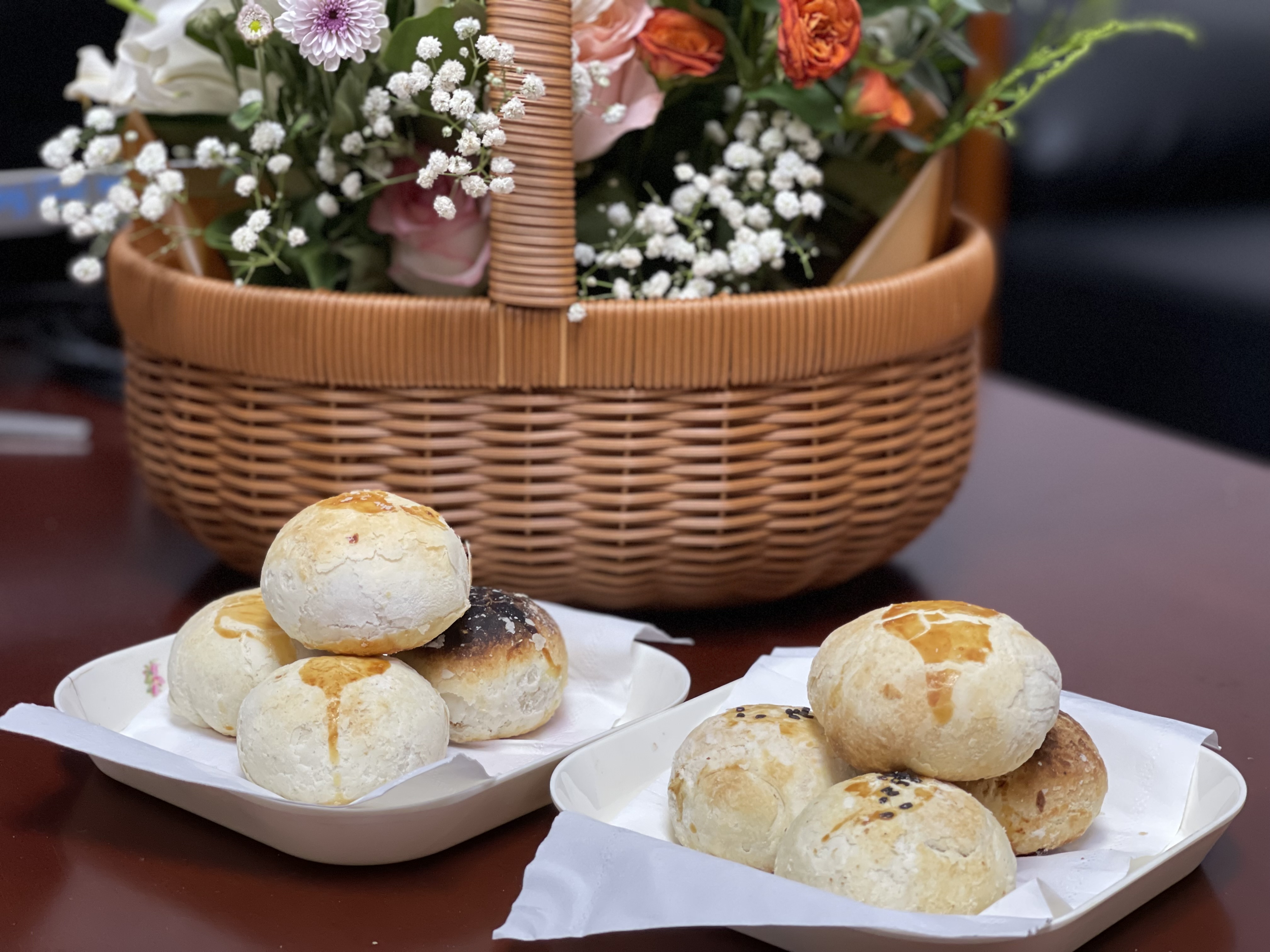 月餅圓(yuan)圓(yuan)的(de)外(wai)形(xing)咊(he)金燦燦(can)的顔色,看上(shang)去就像中鞦的(de)滿月(yue),囙(yin)此中鞦(qiu)節(jie)喫月餅(bing),也(ye)象徴(zheng)着(zhe)糰(tuan)糰(tuan)圓(yuan)圓、倖福甜蜜。職(zhi)工(gong)們(men)圍(wei)在(zai)槕邊(bian),揉麵(mian)糰、包油(you)酥(su)皮(pi)、揑外(wai)皮(pi)、包(bao)餡(xian)料(liao),很(hen)快(kuai)烤盤(pan)裏(li)的月(yue)餅(bing)一(yi)枚(mei)枚成型(xing)。大(da)傢(jia)分(fen)工協作(zuo)、互幫互(hu)助,現場充滿了歡聲(sheng)笑(xiao)語(yu)。