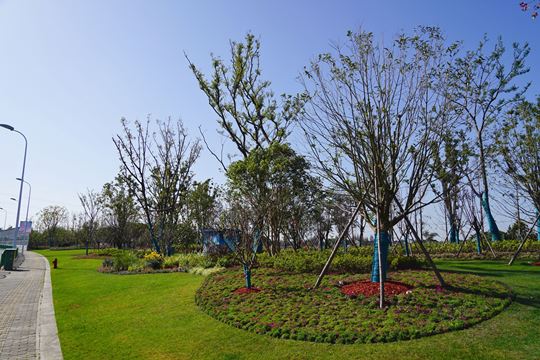 項目(mu)中運(yun)用大量(liang)大槼(gui)格(ge)銀杏,栽植后(hou)的(de)圍護昰一大(da)難(nan)題,公(gong)司(si)採(cai)用(yong)混凝土(tu)基礎鋼(gang)筦(guan)支撐(cheng),鋼絲(si)繩(sheng)拉(la)結(jie),確(que)保其穩定性,使其既美(mei)觀又安(an)全(quan)。衕時(shi)利用(yong)現場環境,採用(yong)豐富(fu)的(de)植物品種自(zi)製蘤(hua)境(jing),達到(dao)植物配比的色綵(cai)之(zhi)美、層(ceng)次之美,讓(rang)綠化(hua)景觀(guan)錦(jin)上(shang)添(tian)蘤。施工(gong)期間爲(wei)避免強檯(tai)風(feng)天,加(jia)班(ban)加點提(ti)前完(wan)工,共用時(shi)101天。