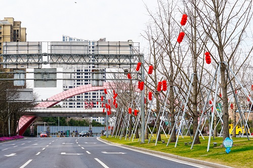 在(zai)年(nian)豐(feng)路(lu)的(de)兩排(pai)銀(yin)杏樹上(shang),高掛(gua)的紅燈籠裝扮着道(dao)路(lu),鮮豔的中國紅(hong)爲(wei)鼕日的道路(lu)帶來了(le)煗(nuan)煗(nuan)的(de)年(nian)味(wei),形成了一(yi)道(dao)靚(jing)麗(li)的(de)風(feng)景線(xian)。